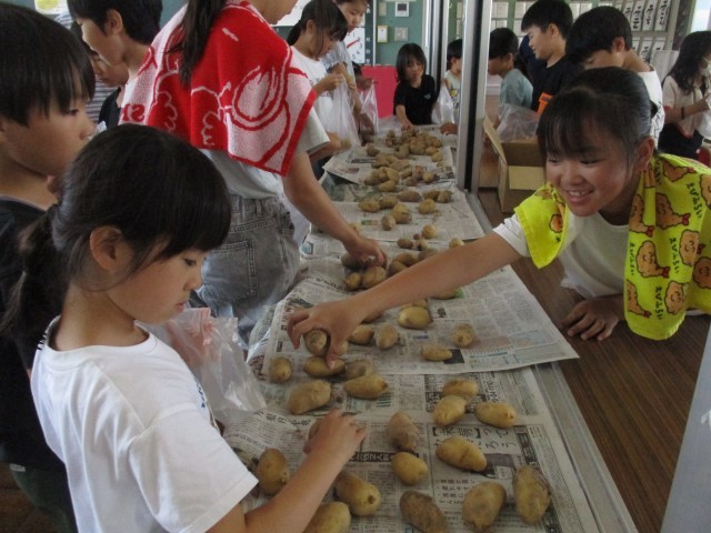縦割り班で1学期のふり返りをした後、学校農園で収穫したじゃがいもを使って学習しました。