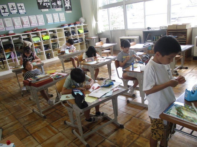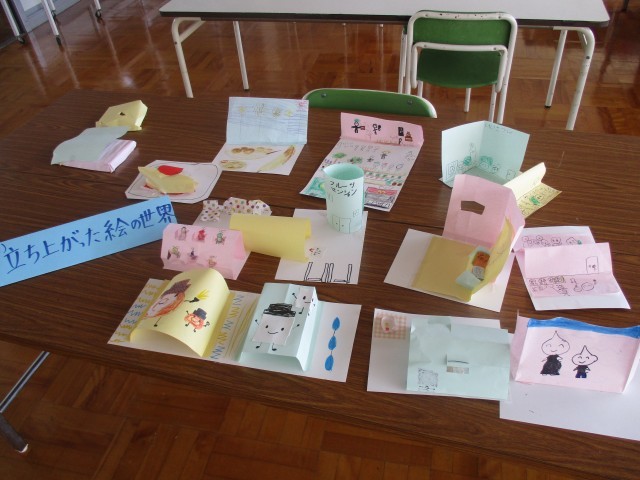 3年生は、「立ち上がった絵の世界」というテーマで、立体的に絵を表す学習をしました。