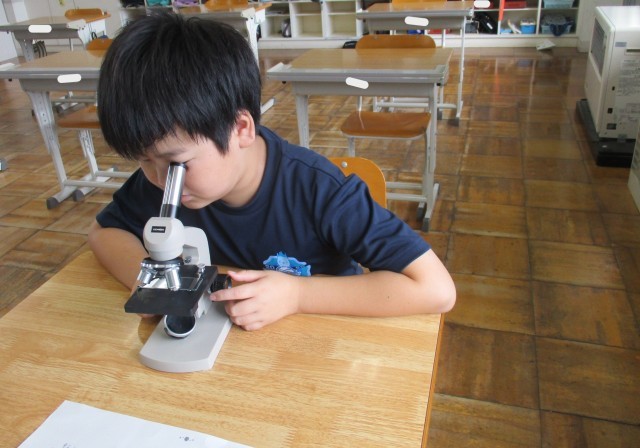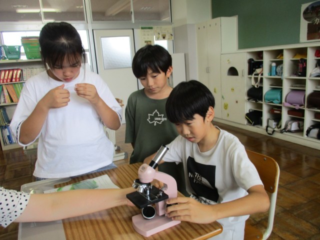 5年生は、花粉を顕微鏡で観察しました。様々な形の花粉に驚いていました。