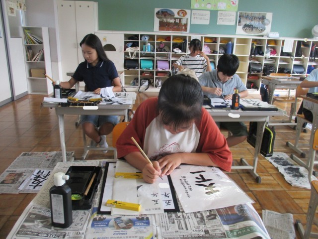 書写の時間では、5年生が「成長」6年生が「友情」を集中して書きました。