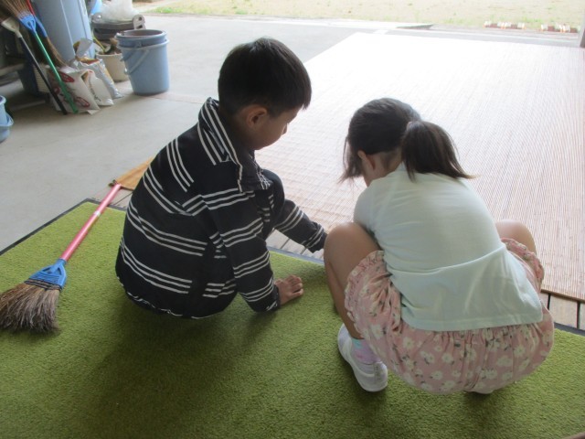 グラウンド玄関に敷いてあるカーペットに付いているゴミをガムテープを使って丁寧に取ったり、児童玄関に落ちている砂をほうきで集めたりして、自分たちがくらす船峅小学校の環境を整えようと取り組む姿勢が見られました。