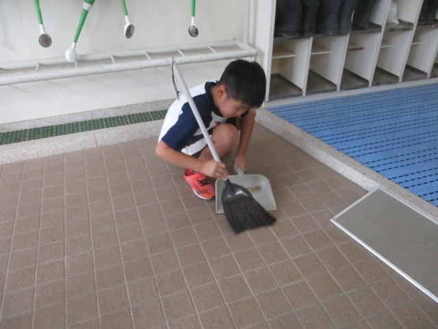 児童玄関前、グラウンド玄関前を担当するグループの子供たちも真剣に清掃に取り組みました。