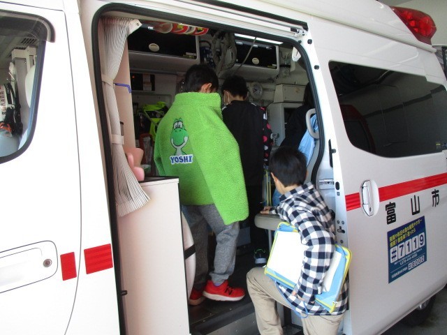 火事で出動される際の装備や消防車、救急車等について、実物を見せていただきながら学びました。