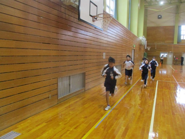 今日は、2限目に3~6年生合同で体育を行いました。まず、赤団と白団の対抗で、折り返しリレーをしました。「頑張れ!」「もうちょっとだよ!」など、友達への温かい言葉が多く聞かれました。その後、一定の時間内に同じコース走る持久走を、駅伝大会に向けて行いました。室内でも、集中して体力づくりをすることができました。