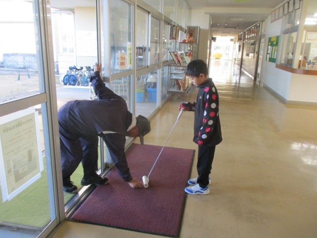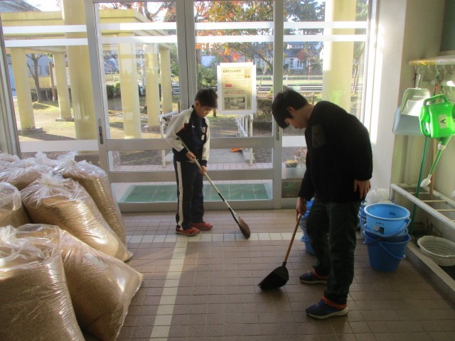 児童玄関を担当する班の子供たちは、玄関の床はシュロほうき、カーペットの上は粘着クリーナーを使うなど、場所に合わせて掃除用具を使い分けて、黙々と掃除をしていました。