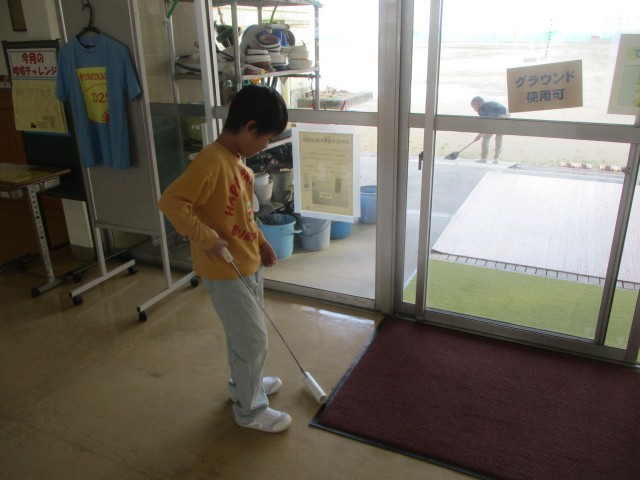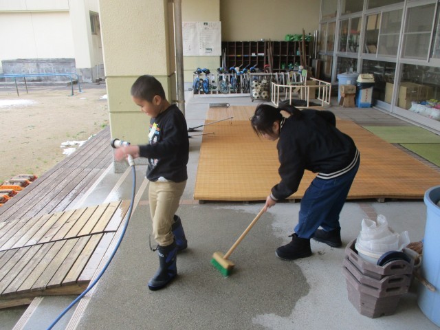 今日の縦割り清掃では、グラウンド玄関を担当する子供たちが真剣な様子で掃除に取り組みました。水で濡らした床をデッキブラシを使い磨いたり、粘着クリーナーを使ってカーペットに付いたホコリを取ったりしました。子供たちには、それぞれの清掃用具の使い方を、身に付けてくれたらよいなと思います。