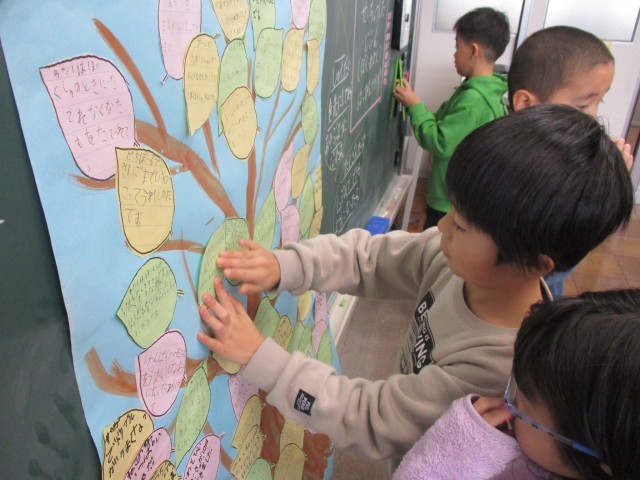 1・2年生の生活科では、自分ができるようになったこと、がんばったことをカードに書き、「成長の木」に貼りました。