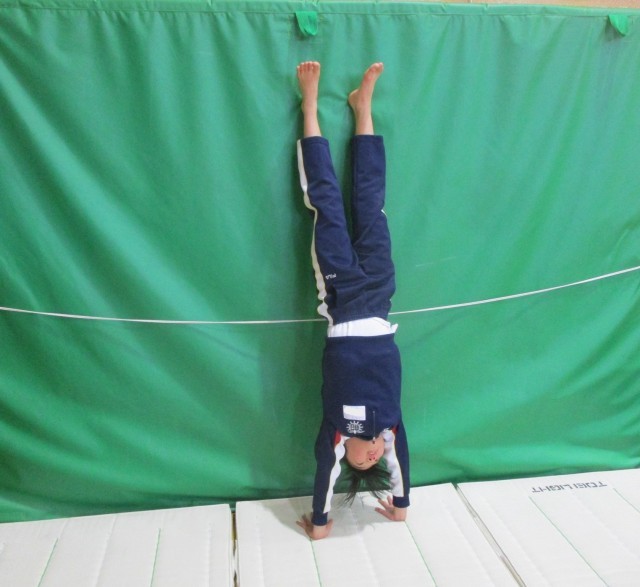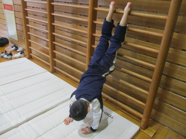 今日の朝活動は、鉄棒運動とマット運動に分かれ、チャレンジ技7のカードに載っている技に取り組みました。体育館では、3~6年生が、マット運動の回転技と倒立技に挑戦しました。倒立技の練習では、セーフティーマットや肋木を使って、かべ登り倒立やかべ倒立に取り組みました。子供たちは、真剣な様子でした。