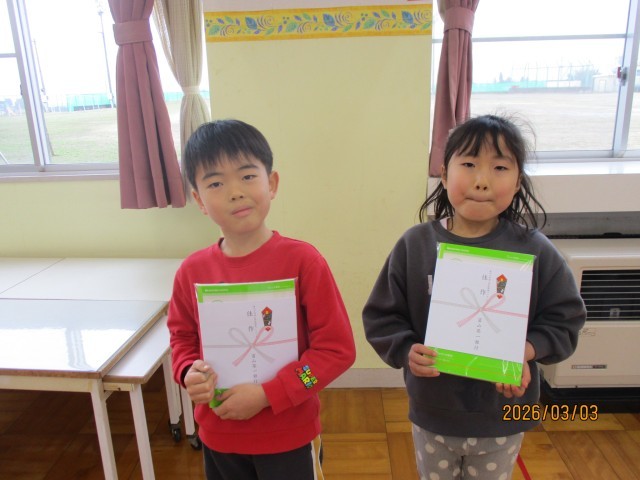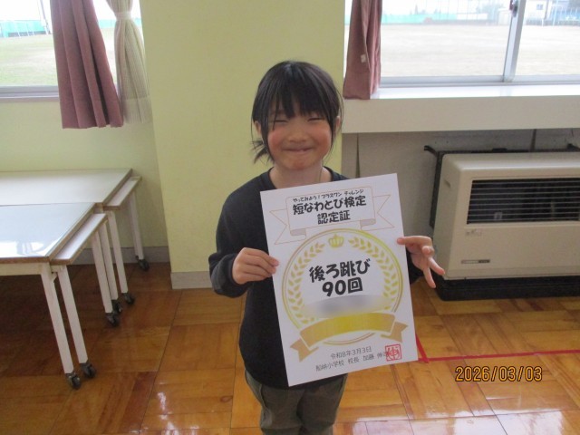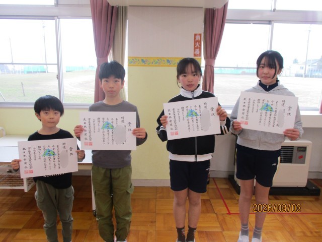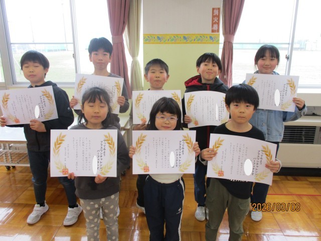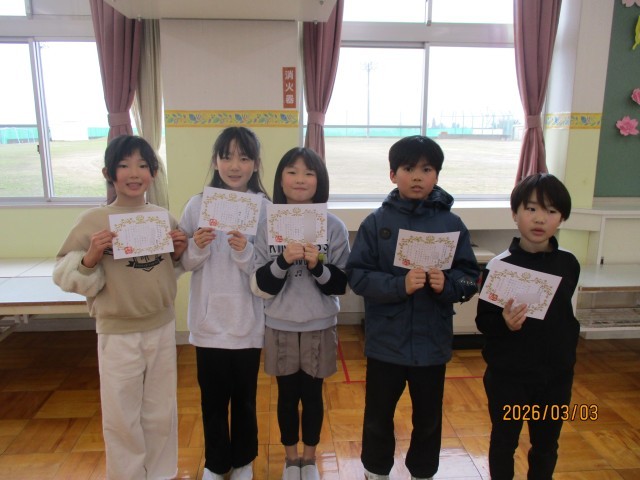 今日は暗唱チャレンジとなわとび検定の表彰のほか、図画コンクール「わたしのママ、パパをかきましょう」佳作表彰者紹介、県書初大会出品者表彰がありました。