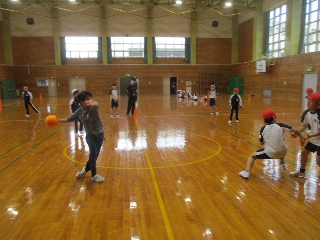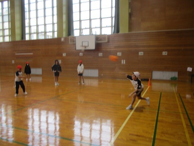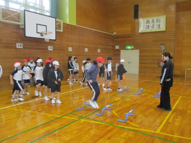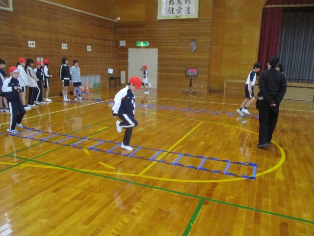 今日は、2限目に3~6年で合同体育をしました。来週、全校で50m走の計測を予定しているため、短距離走のサーキットトレーニングをしました。ラダーやミニハードルを使って、両足跳びやもも上げをして、正しく走るフォームを確認しました。「前よりも速くなったような気がした」「来週、頑張りたいと思った」など、子どもたちから率直な感想が出ました。その後には、赤白団対抗で、ドッヂボールを楽しみました。