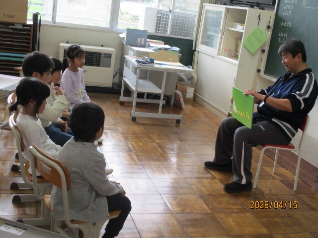 4月15日(水)1年生 紙芝居 公開日 2026/04/15 更新日 2026/04/15 今日の船峅っ子 これは、1年生が紙芝居を見ている様子です。お話の世界にぐっと入り込んで聞いている表情が素敵でした。