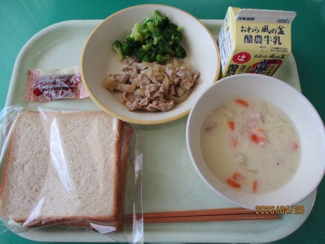 食パン 牛乳 ポークソテー ゆでブロッコリー クリームシチュー メープルジャム