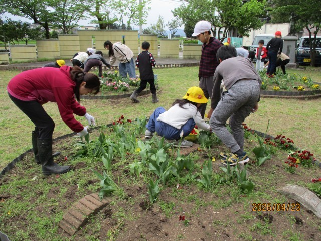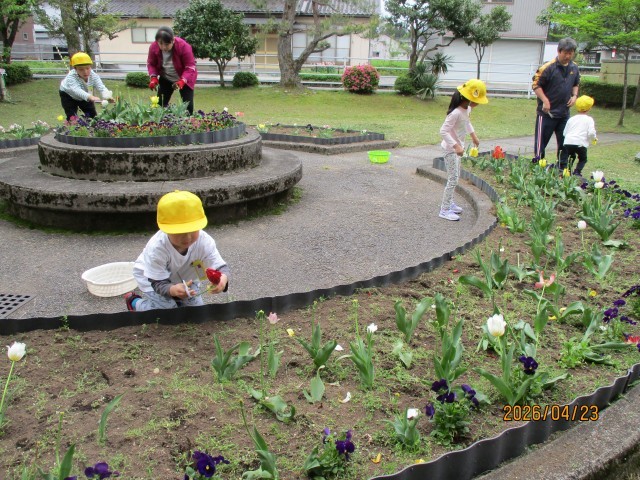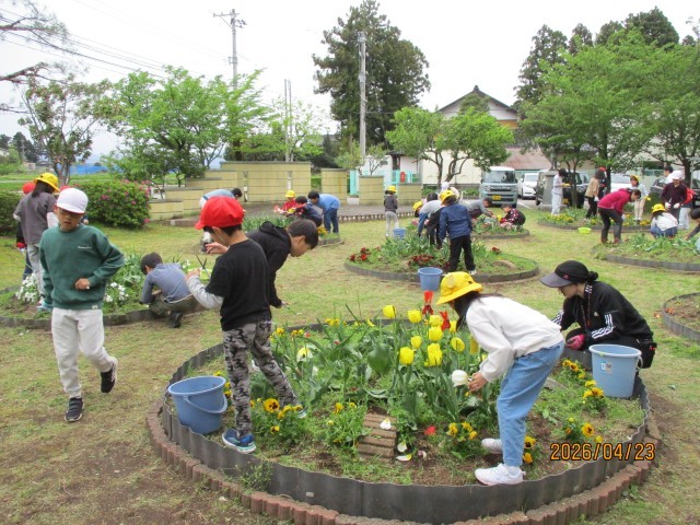 今朝は1~5年生で、チューリップの花摘みをして、草取りもすると、パンジーの花の存在感が増しました。