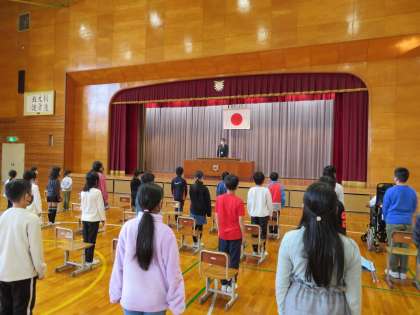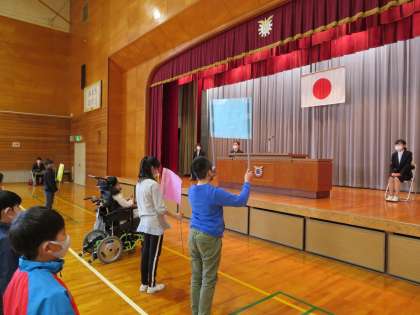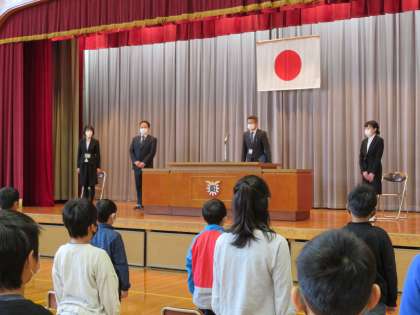着任式では、新しく来られた先生方に船峅小学校のよいところや、みんなの合言葉を紹介し、元気よさや仲のよさをアピールしました。