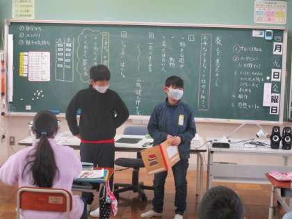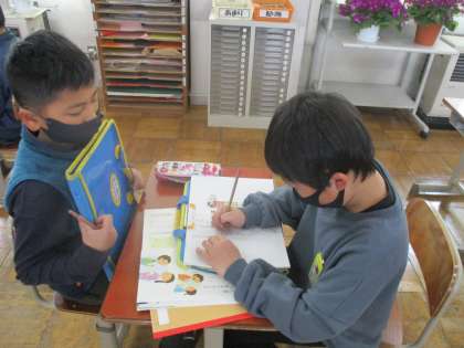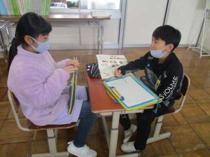 友達に1分間インタビューをして、特に心に残ったことをみんなに紹介する活動をしました。好きな動物や一度会ってみたい人物などについて、友達から詳しい情報を聞き出すために質問をよく考えながらインタビューする子供たちでした。