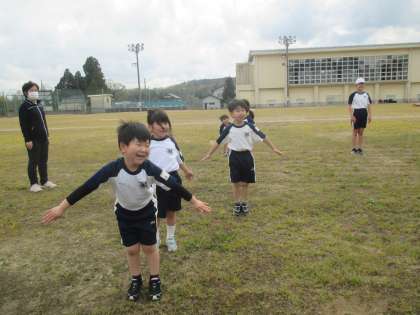 準備体操では文字を体で表現したり、他学年のおにいさんおねえさんと一緒に鉄棒にチャレンジしたりしていました。