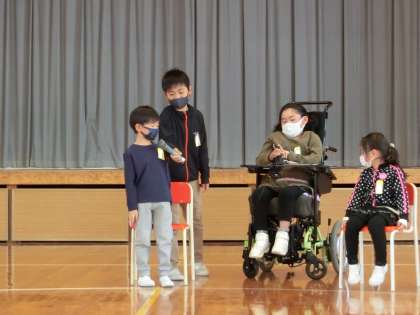 1年生さんへのインタビュータイムには、すきな動物や将来の夢、小学校でがんばりたいことなどを聞くことができました。