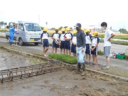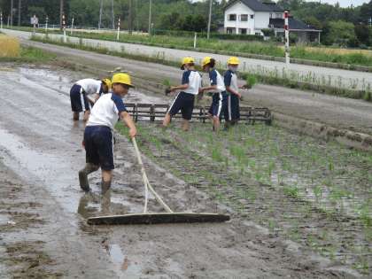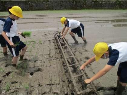 地域の農家の方に協力していただき、植え体験をさせていただきました。昔ながらの手植えや機械での作業など貴重な体験ができました。土の感触や初めての体験に大興奮の子供たちでした。地域の方に支えられて学ぶ船峅の子供たちです。