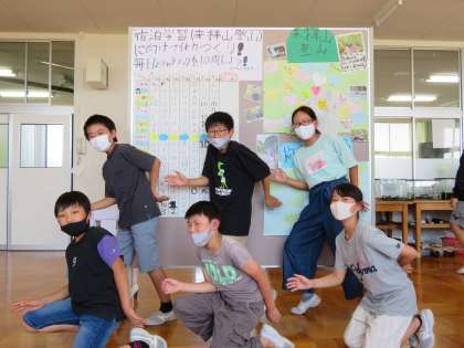 下校の前には、キャンプファイヤーを盛り上げる歌を歌い、班ごとにポーズを決めて「やる気満々集合写真」を撮りました。