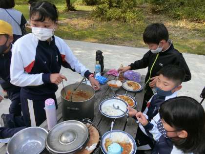 1日目の夕食は、野外炊飯の活動でカレーづくりをしました。調理実習の経験や家での練習を生かしながら、班のメンバーで力を合わせておいしいカレーをつくりました。仲間と協力してつくったカレーは一段とおいしかったようです。