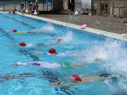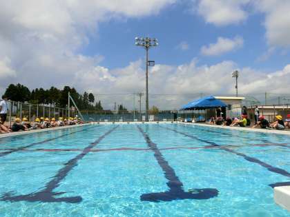 青空の下、プール開きが行われ、水泳学習がスタートしました。
