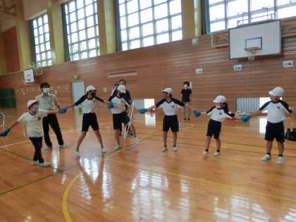 今回の集会は、児童会推進委員の6年生が中心となり、団や班のチームワークや絆を深めるための集会でした。