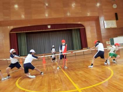 団のみんなで手をつなぎ、手を離さないようにしながらフラフープをくぐったり、たて割り班で力を合わせてつな引きをしたりしました。