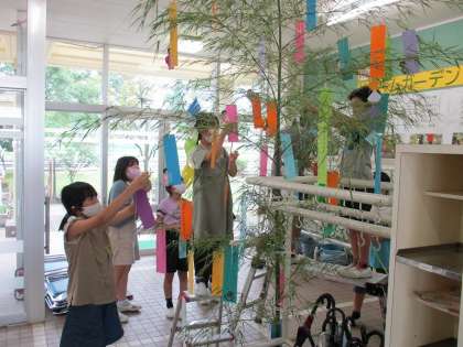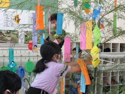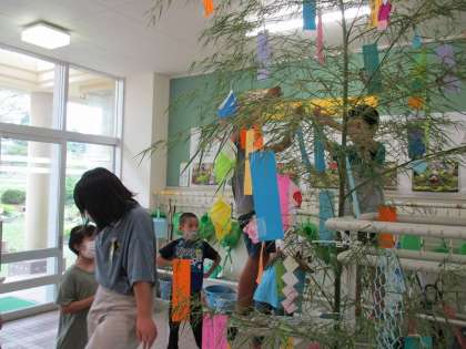 玄関前に大きな笹が来ました!そして、教室にも小さな笹を置きました。子供たちは自分の願いを短冊に書き、それぞれの笹に飾りました。