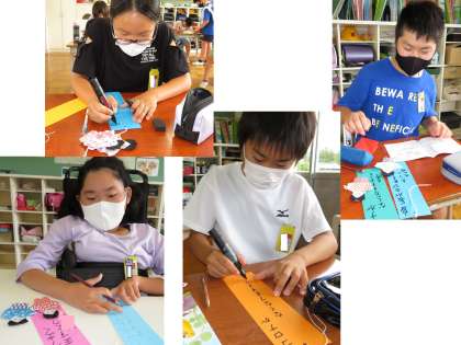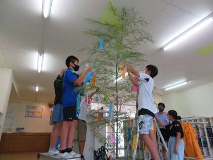 子供たちは、休み時間に自分たちの願いを短冊に書き、思いを込めて結び付け、すてきな七夕飾りができあがりました。