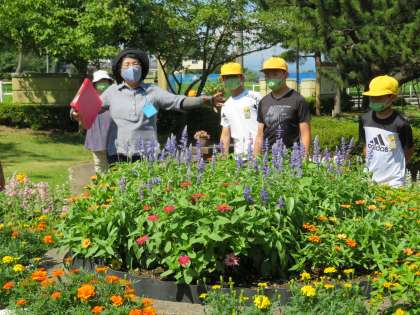 2週間前の市のコンクールのときに比べると、花株も大きくなり、サルビアやメランポジウムの花が花壇を彩るなど、夏の到来に合わせて色とりどりの花壇になってきました。