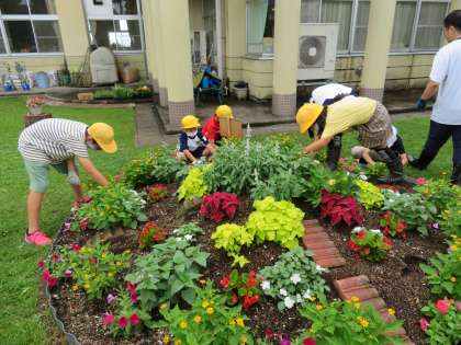 1学期、若草班ごとに取り組んだドリームガーデンの栽培活動。デザインを担当した6年生を中心に、苗植え、水やり、草取り、花摘み等の世話を班全員で続けてきました。
