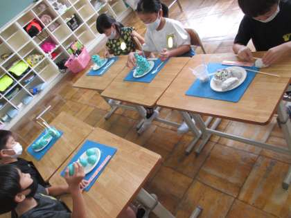 図画工作科の学習では、粘土を使ってごちそうを作り、完成した後にパーティーを開きました。子供たちは、好きな食べ物を想像して楽しく活動に取り組んでいました。