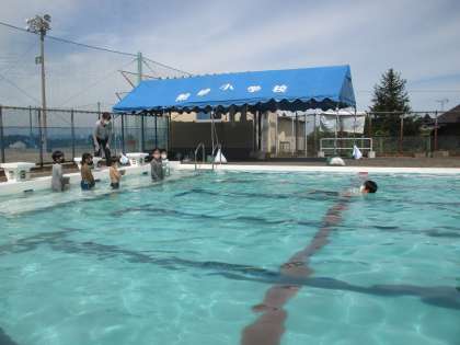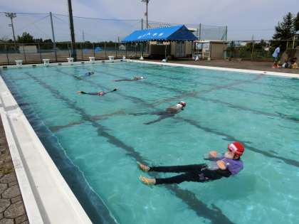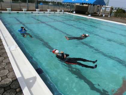 服を着て水中(プール)に入ると動きにくいことや、ビーチサンダルを履いていると足が浮きやすいこと等、短い時間でしたが命を守る貴重な体験ができました。
