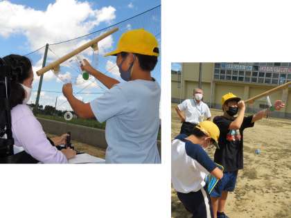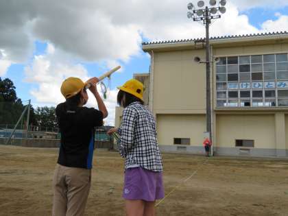 分度器と筒を使った測量道具を手にすると、目標物までの角度を何度も確認しながら測量しました。
