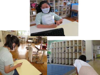 教室、体育館、玄関、そして花だんと、それぞれの思い出の場所を選んで黙々と鉛筆を動かす子供たち。