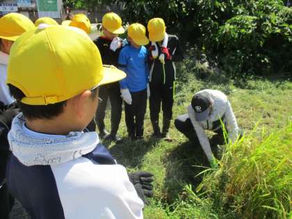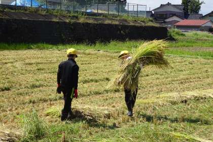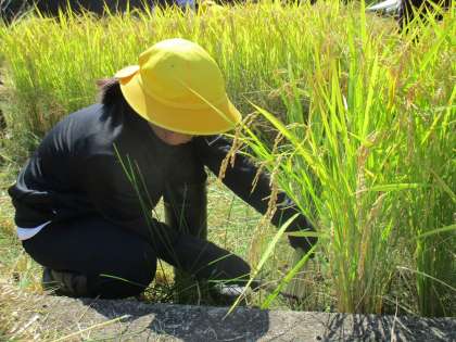 地域の方のご厚意により、小学校に隣接する田んぼで稲刈り体験をさせていただきました。