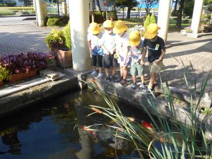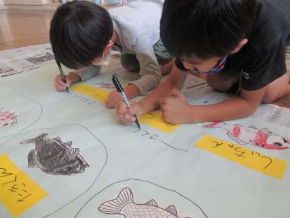 1年生の生活科の学習では、学校の池にいる7匹の鯉の名前を考えたり、毎朝餌やりをしたりして、鯉と仲良くなろうと頑張っています。登下校時には、「鯉さん、おはよう」「鯉さん、さようなら」と挨拶をし、鯉と関わりながら成長していく子供たちの姿が見られます。