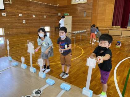 作った空気砲で玉を飛ばしたり、的当てをしたりして空気の力を楽しみました。