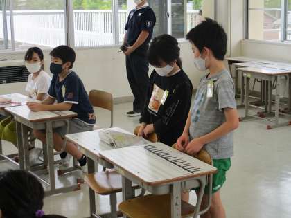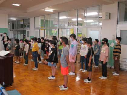 朝の合唱練習では、1年生から4年生がいっしょに「歌えバンバン」を歌いました。初めての合同練習でもしっかり声を出して歌う姿からは、一番上の学年としての気持ちが感じられました。