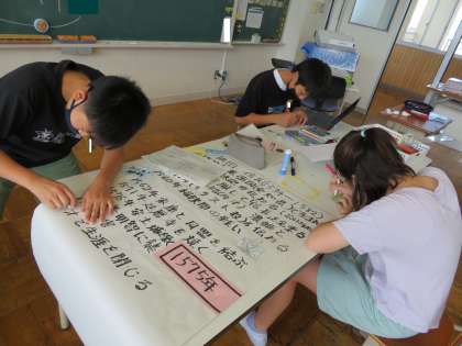 わたしたちは、織田信長・豊臣秀吉・徳川家康の三人の武将について、一人一人が図書室の本やインターネットで天下統一に向けての出来事やエピソードについて調べ、大型の年表を作って学習を進めています。
