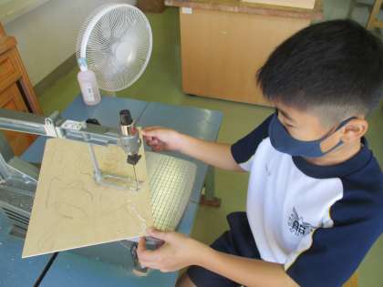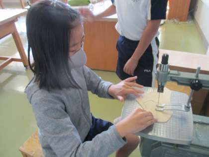 5年生では、糸のこを使ってホワイトボードを作っています。木材に描いた下絵に沿って、上手に板を動かしながら、木材を切りました。簡単に木材が切れる様子に驚いた子供たちでした。糸のこの安全で正しい使い方を学習することができました。