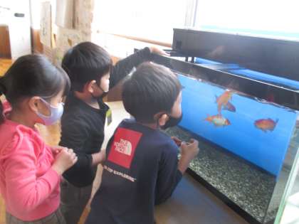 学校で飼っている金魚のお世話をしている様子です。「おはよう、ごはんだよ〜」と声をかけながら、一粒ずつ丁寧に餌やりをする子供の姿が見られます。