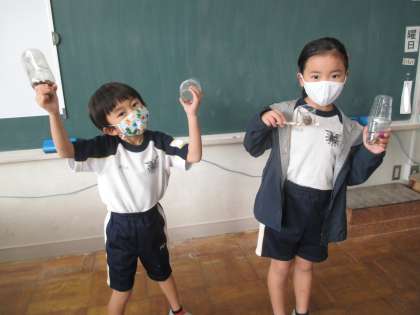 校庭で見つけたドングリやマツボックリを使って工作をしました。ペットボトルの中にドングリをたくさん入れて音を楽しんだり、マツボックリを使ってけん玉を作ったりと、見つけた秋で工夫して遊びました。