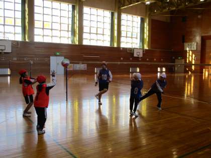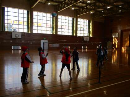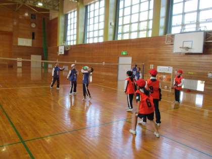 体育科の学習で、キャッチバレーボールに取り組んでいます。キャッチ、パス、アタックといった基本的な動きが身に付き、ゲームの中でも以前より長くラリーが続くようになりました。各団で練習の内容も自分たちで話し合って、得意なことを伸ばすのか、苦手な部分を練習するのかなどを考えながら取り組んでいます。
