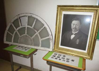 12月1日の創校記念日に全校の集会を開きました。その際に紹介した木造校舎のアーチ窓や、校舎建築功労者の加藤幸次郎さんの肖像画や校舎の変遷について、子供たちが実際に目にすることができるよう、校長室前の廊下に展示しました。今週中は展示する予定なので、保護者や地域の方々でご覧になりたい方は、ご来校ください。