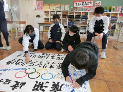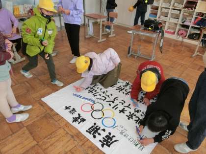 6年生の子供たちは先輩の活躍を祈念して、全校のみんなの寄せ書きをした応援旗をつくりました。