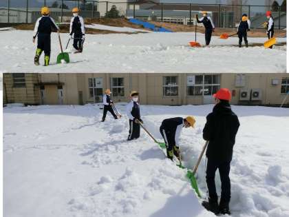 3月に入り暖かい日が続いたので、「グラウンドを走ろう!」ということになり、先週の金曜日(3月4日)に校舎の陰になる部分の除雪をみんなで行いました。(1枚目の写真)