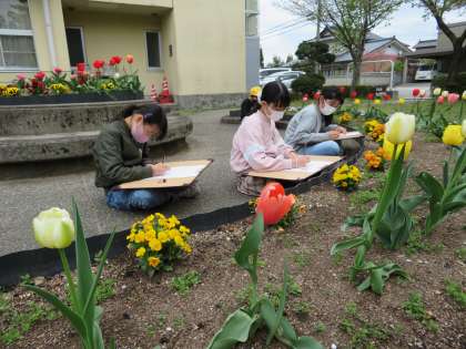 6年生は、鉛筆1本と画用紙を持って前庭に出て、チューリップをじっくり見ながら鉛筆画に挑戦しました。