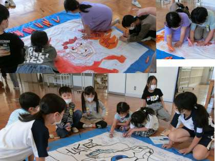 赤団は赤やオレンジのマジックで、白団は青色のマジックで願いや思いを書き込み、応援旗が完成しました。