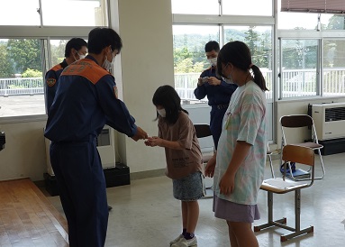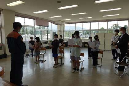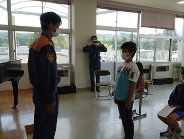 5月23日(月)5年生 BFCバッジ授与式 公開日 2022/05/23 更新日 2022/05/23 3・4年生 5年生は、学校を代表して「少年消防クラブ(BFC)」に入会し、率先して防火活動に努めます。今日は、大沢野消防署から職員の方が来られ、バッジ授与式を行いました。緊張しながらも、学校の代表として、真剣に参加しました。